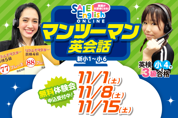 | 内容 | 小学生向け英語レッスン【日本人講師×外国人講師(オンライン型マンツーマン)】 日本人講師とのレッスンで学習した単語や文法を活用し、外国人講師と1対1の実践練習を行うことで英語力を効率的に向上させ、生徒一人ひとりの自信を育みます。 高校・大学入試で有効な英検資格の取得を、小学生の早い段階からサポートする学習方法をご提供します。 小学生で英検3級、中学生で2級・準2級、高校生で準1級合格を目指しましょう! |