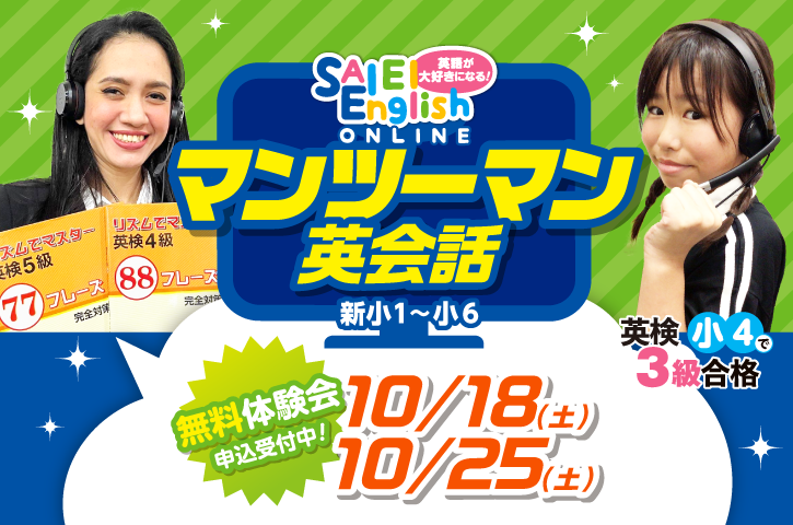 内容 | 小学生向け英語レッスン【日本人講師×外国人講師(オンライン型マンツーマン)】 日本人講師とのレッスンで学習した単語や文法を活用し、外国人講師と1対1の実践練習を行うことで英語力を効率的に向上させ、生徒一人ひとりの自信を育みます。 高校・大学入試で有効な英検資格の取得を、小学生の早い段階からサポートする学習方法をご提供します。 小学生で英検3級、中学生で2級・準2級、高校生で準1級合格を目指しましょう! |