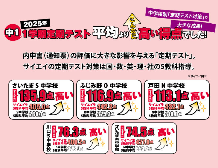 サイエイの定期テスト対策授業は国・数・英・理・社の5教科指導。地域の中学校に合わせた定期テスト対策で大きな成果を上げています。