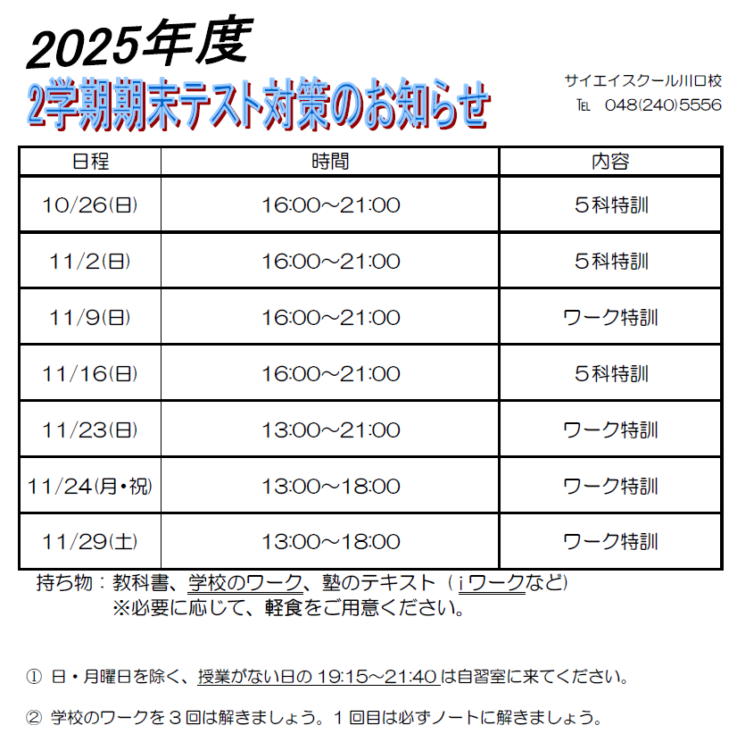 - テスト勉強は試験日3週間前から開始しましょう!!