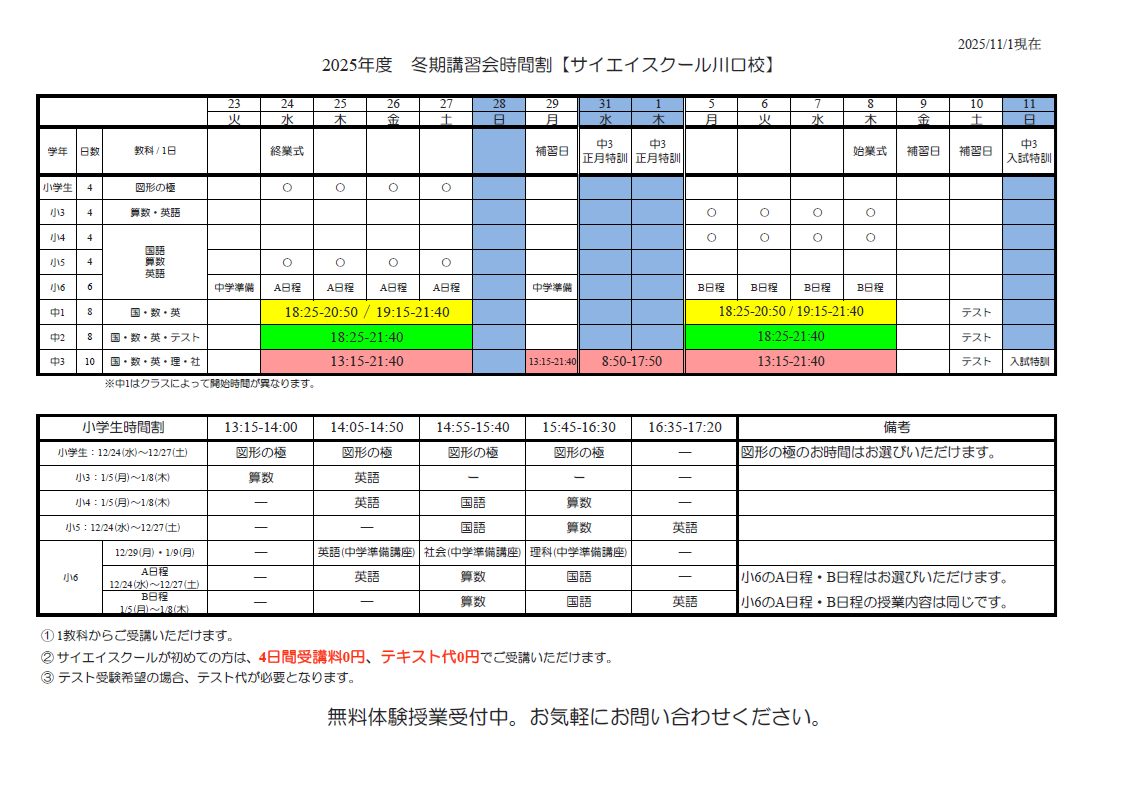 一緒に、素敵な新学年のスタートを!!!現学年 科目 日数 小学1,2年生 図形の極 全4日間 12月24日~12月27日 小学3年生 算数・英語 全4日間 1月5日~1月8日 小学4年生 国語・算数・英語 全4日間 1月5日~1月8日 小学5年生 国語・算数・英語 全4日間 12月24日~12月27日 小学6年生 新中1安心スタートコース国語・算数・英語・理科・社会 全6日間※ 中学1年生 国語・数学・英語 全8日間 12月24日~12月27日1月5日~1月8日 中学2年生 国語・数学・英語 全8日間 12月24日~12月27日1月5日~1月8日 中学3年生 国語・数学・英語・理科・社会 全8日間 12月24日~12月27日1月5日~1月8日 ※小学6年生の国語・算数・英語は、A日程、B日程ともに同じ内容を取り扱います。ご都合のよろしい方でご参加ください。