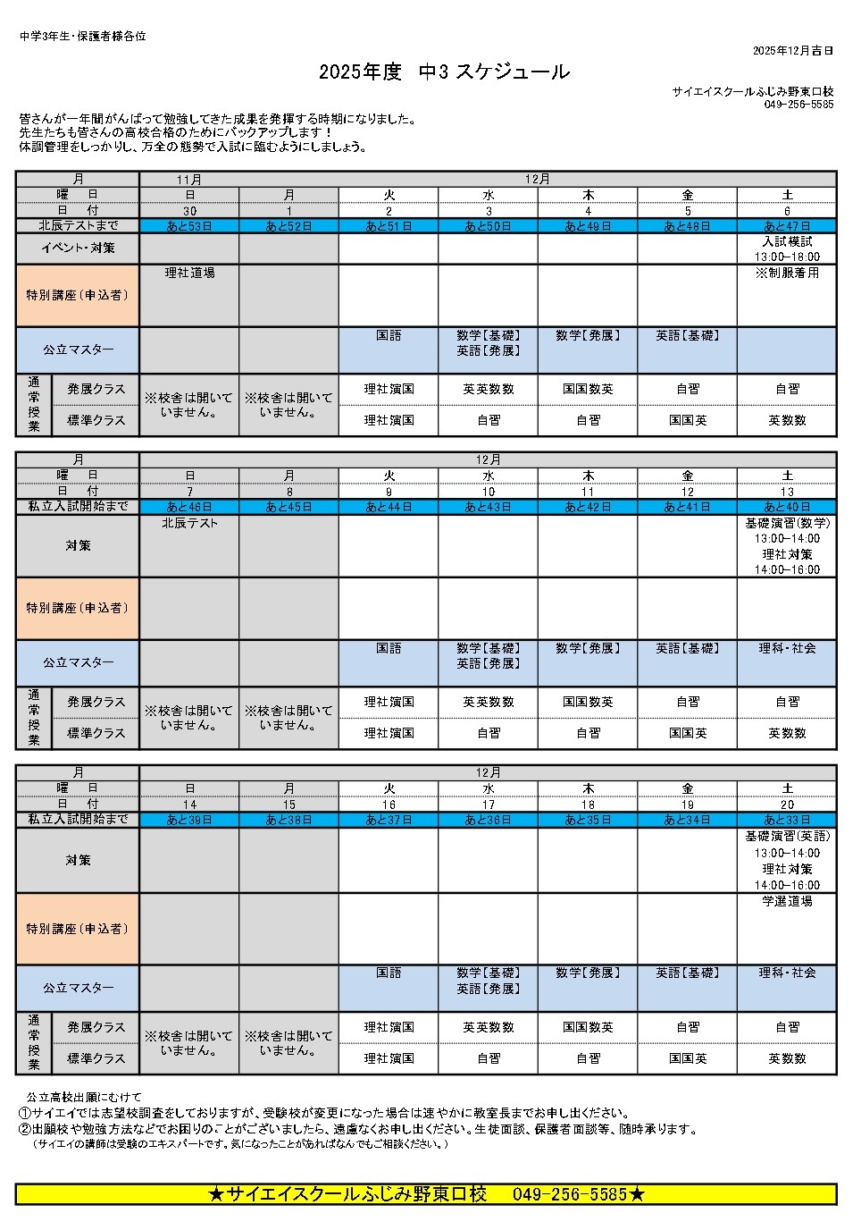 直前に疑問や不安を解消してからテストに臨むことができます。ふじみ野東口校 2024年度通常授業時間割