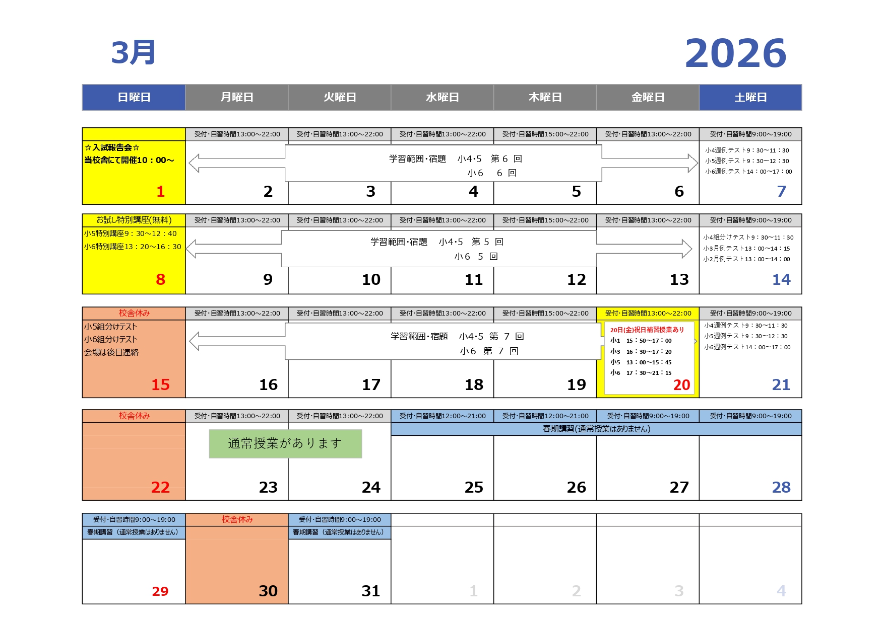 新年度に向けて以下の日程で開講説明会を行います。中学受験を始めてみようとお考えの方、どうしようか迷っている方はぜひご参加ください。当校舎の特長や取り組み、日程などご説明致します。