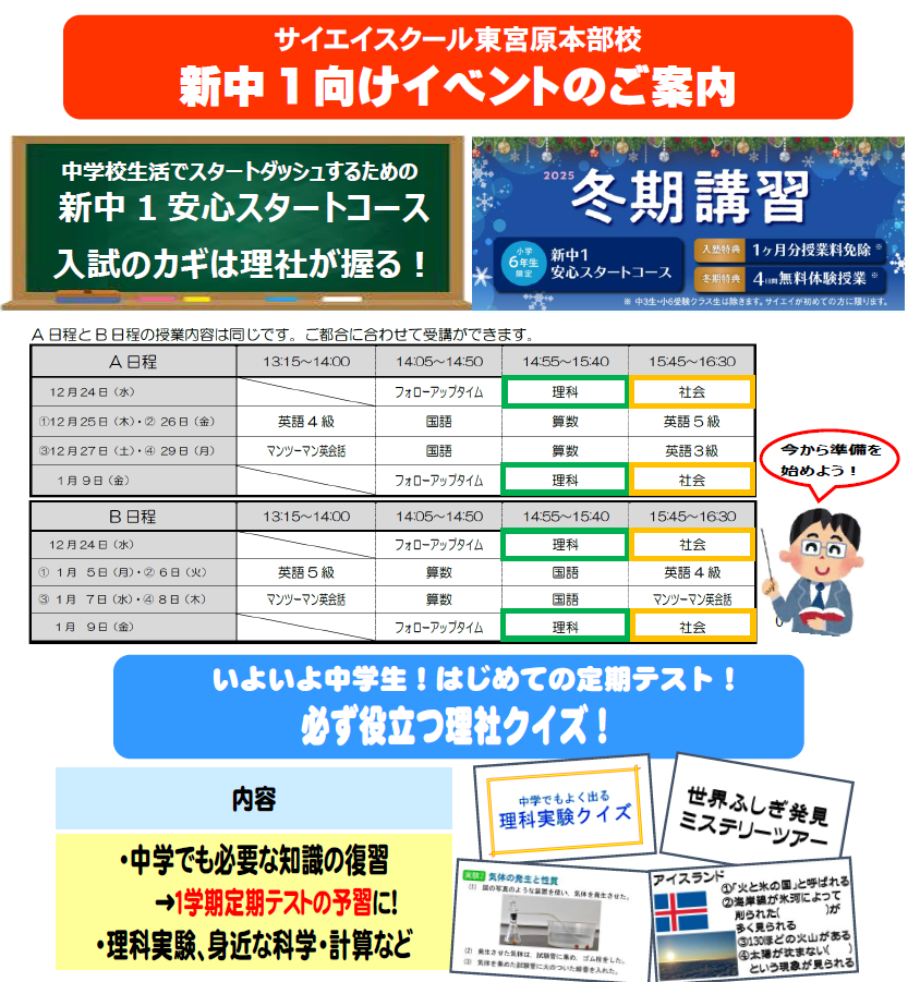その中で冬期講習にて実施する理・社中学入学準備講座に皆さまを招待いたします!