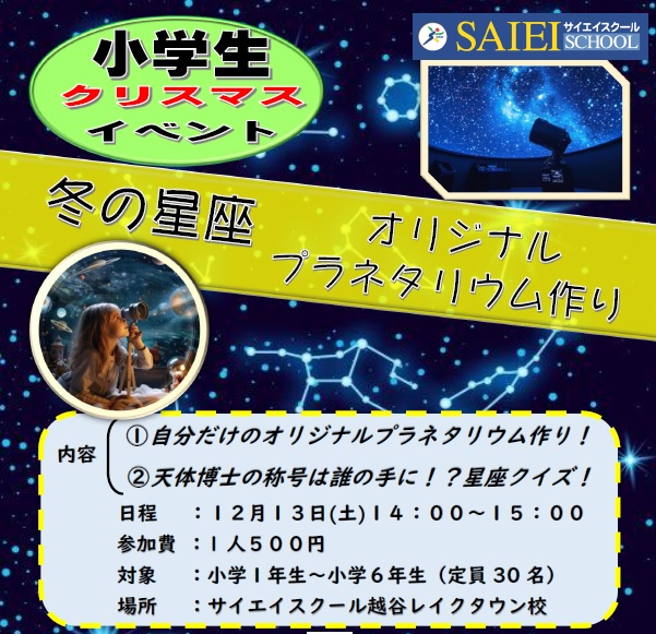 12/13(土)に小学生対象のクリスマスイベントを開催します。サイエイにお通いでない方も大歓迎です!ぜひご友人を誘ってご参加ください。(定員がありますのでお早めにお申し込みください。費用は当日現金でお持ちください。)