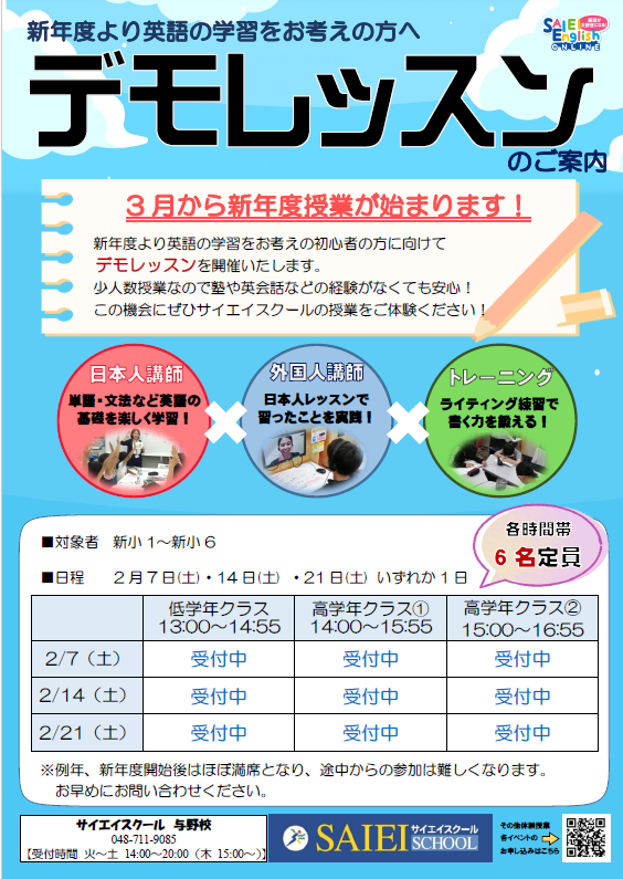 新年度小学生英語初心者クラスデモレッスン予約開始!!
